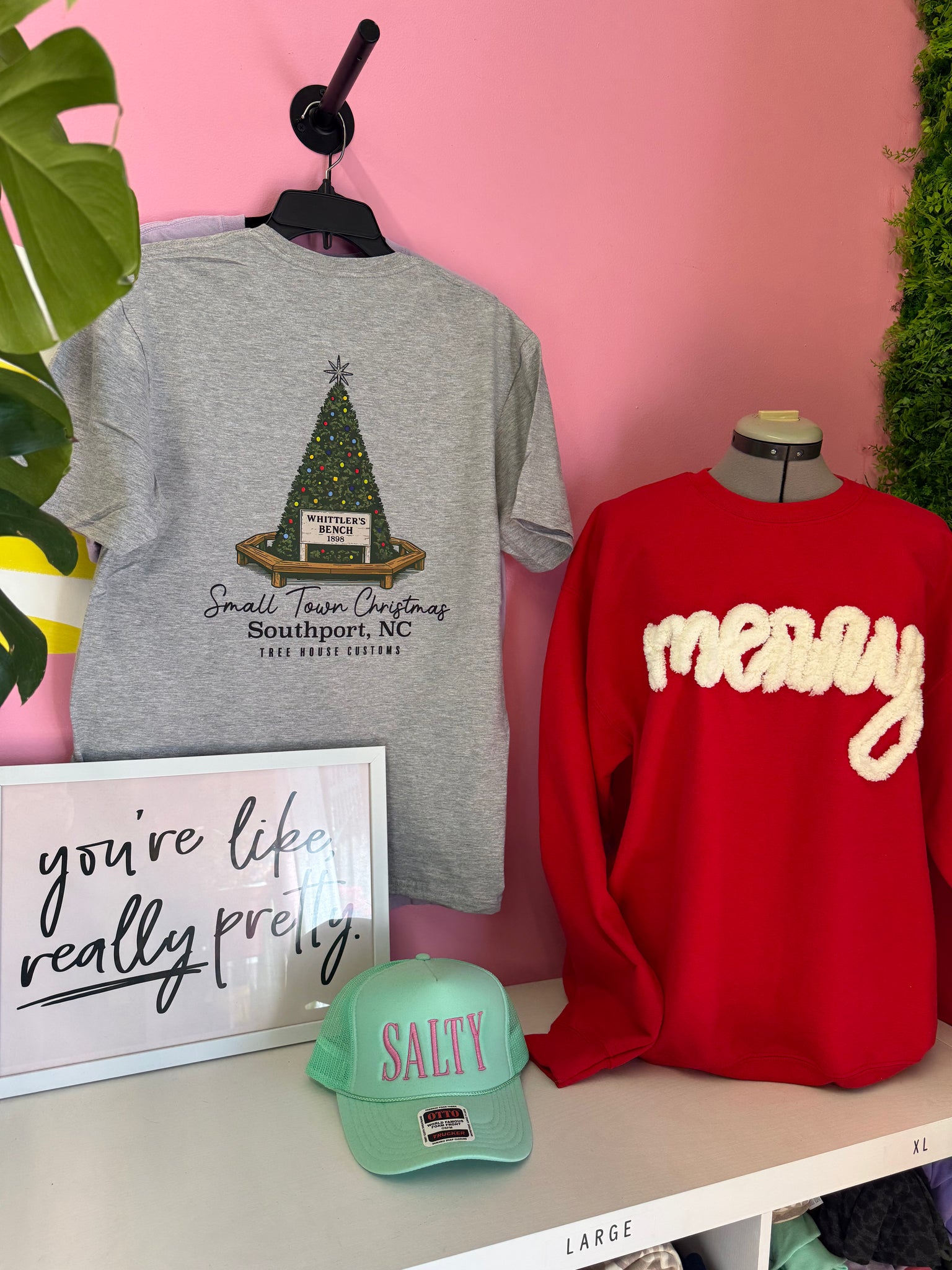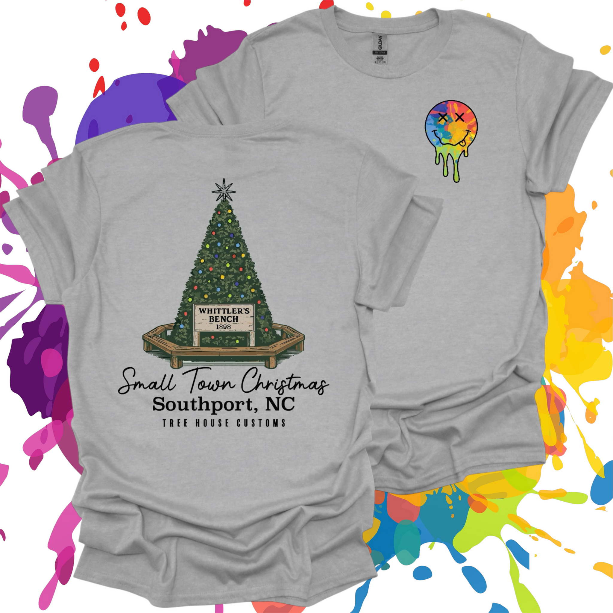 Featuring a hand-drawn illustration of the Whittler’s Bench Christmas tree, this tee captures the cozy, small-town charm that makes Southport feel like home during the holidays. The front chest includes our colorful dripping smiley mark for that perfect Treehouse touch — unique, local, and a little artsy.